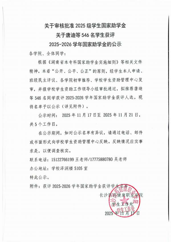 关于审核批准 2025 级学生国家助学金关于唐迪等 546 名学生获评2025-2026学年国家助学金的公示